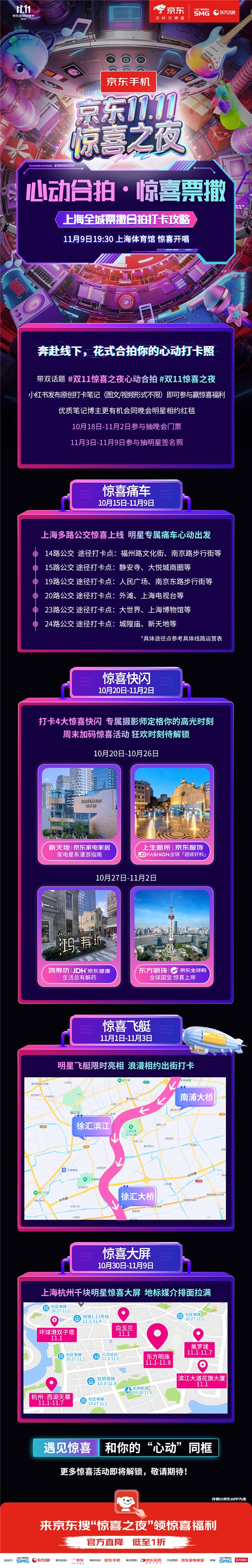 除线上互动外,京东还打造了一系列线下打卡活动,邀请用户在上海解锁惊喜体验:10 月15日至11月9日,上海14 路、15路等多路 “明星专属痛车” 将穿行在上海福州路文化街、外滩、大世界、城隍庙等热门地标,用户打卡拍照即可参与互动;10月20日至11月2日,上海新天地、上生新所、鸿寿坊、东方明珠广场将陆续开启 “惊喜快闪” 活动,不仅有专属摄影师为参与者记录高光时刻,还会有明星空降快闪现场;11月 1 日至11月3日,“明星飞艇” 将限时亮相上海上空,开启浪漫巡游;10月30日至 11 月9日,上海与杭州将实现千块明星惊喜大屏跨城联动,传递 “心动信号”。