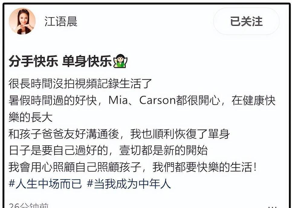 离婚不是失败,是新生活的开始。江语晨说了,离婚后她会好好照顾两个孩子,也会让自己过得开心。她没把离婚当成世界末日,反而像卸下了一个沉重的包袱。2024年的一项调查显示,超过60%的单亲妈妈在离婚后都觉得自己更自由了,能重新找回生活的节奏。江语晨也是这样,她用自己的方式告诉大家,人生没有过不去的坎。