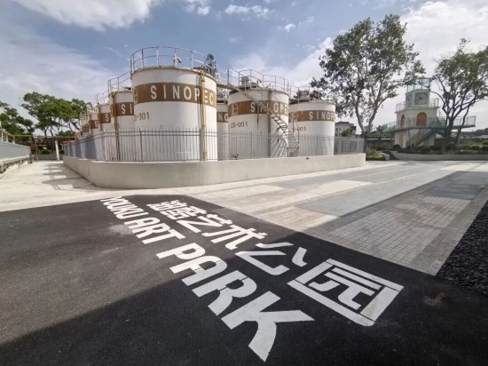 从上海国际时尚中心向西南方向漫步,一座“工业风”十足的油酷艺术公园近在眼前。这座占地近16000㎡的公园,前身是二十世纪初落地上海的洋商亚细亚火油公司站点,如今保留了大型立式旧油罐,斑驳锈蚀的罐体写满了能源发展的历史演变。