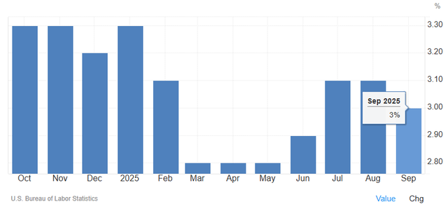 这意味着美联储在做出十月份的利率决定时,无法获得关于近期就业和通胀状况的关键报告。他们实际上是在“盲飞”,只能依赖旧数据和私营部门的指标。这种“数据真空”带来了巨大的不确定性。尽管最后一份官方公布的9月份消费者价格指数(CPI)报告显示通胀率为3.0%,低于预期,为降息提供了支持,但美联储仍然缺失了对经济全局的、最新的完整图景。