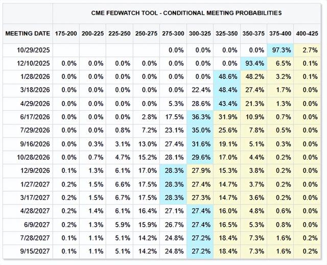 市场已经完全消化了FOMC在10月28-29日会议上降息25个基点的预期。芝商所的FedWatch工具显示,美联储将目标利率下调至3.75%至4.00%区间的概率高达97%以上。